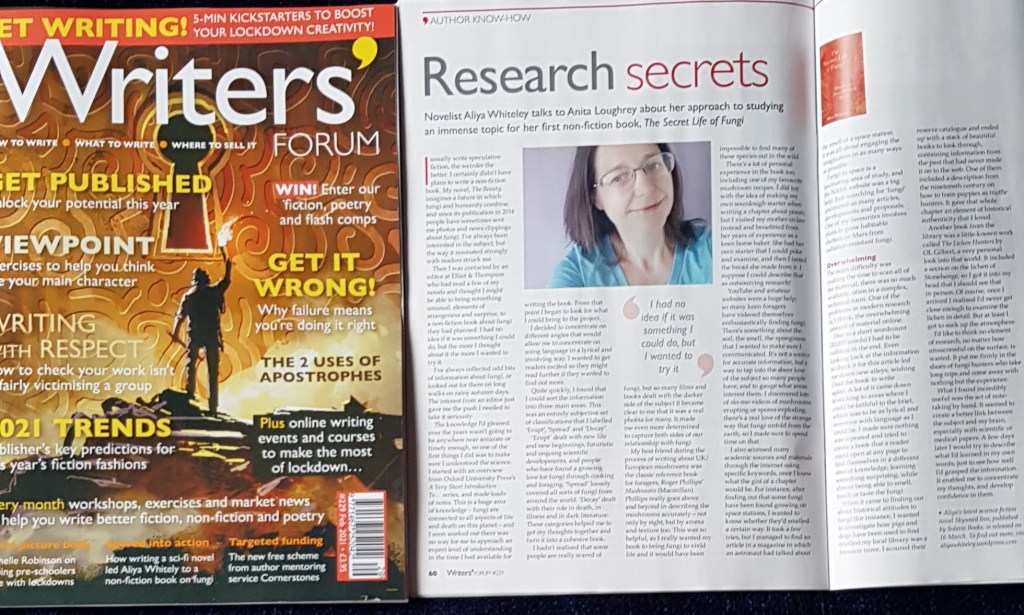 In my Research Secrets slot in February issue of Writers’ Forum Aliya Whiteley told me about her debut non-fiction book, a fascinating insight into fungi entitled, The Secret Life of Fungi: Discoveries from a Hidden World.
