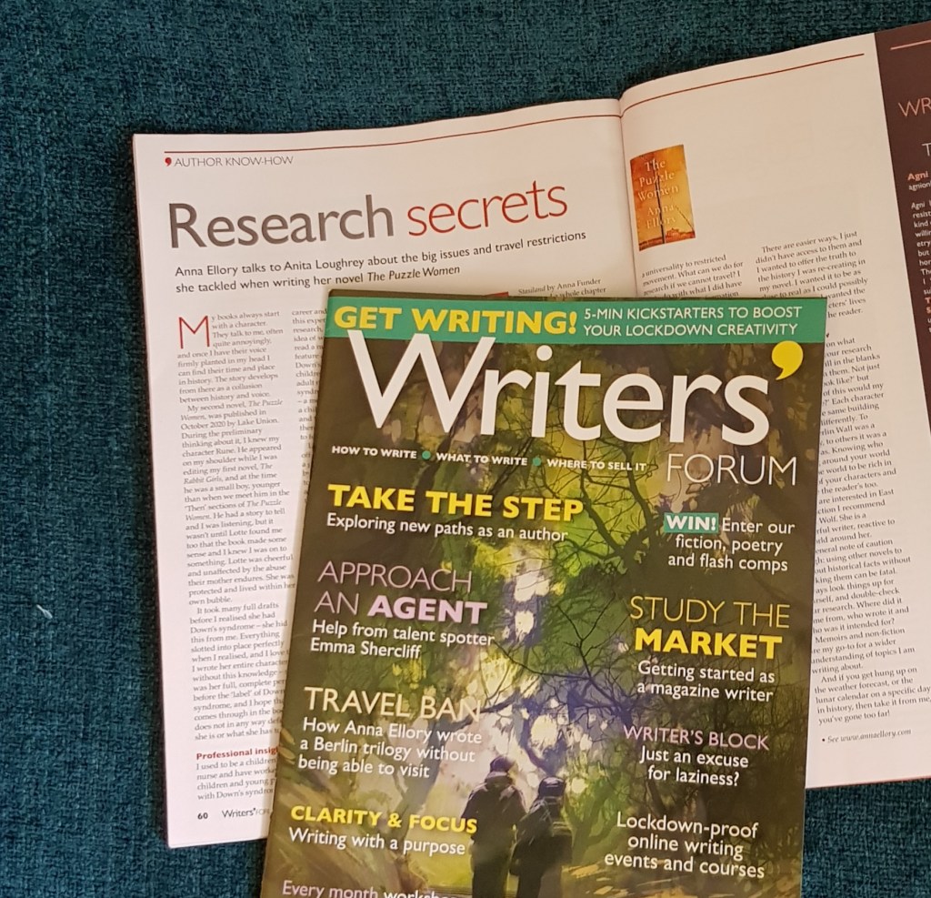 In the March issue of Writers’ Forum I talk to Anna Ellory about the research for her historical novel, The Puzzle Women, and how she combatted travel restrictions.