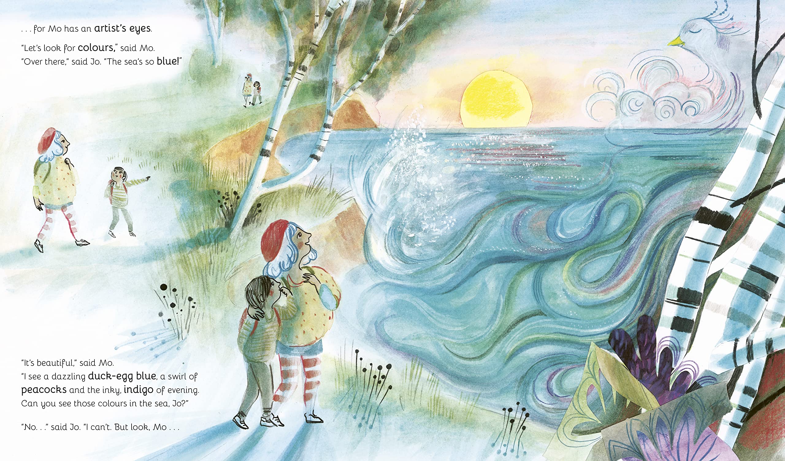 An Artist’s Eyes is a captivating picture book about a little boy called Jo, whose eyes may look the same as Mo, who is an artist, but they see things very differently. He does not see the differences in colour Mo does. She can see: