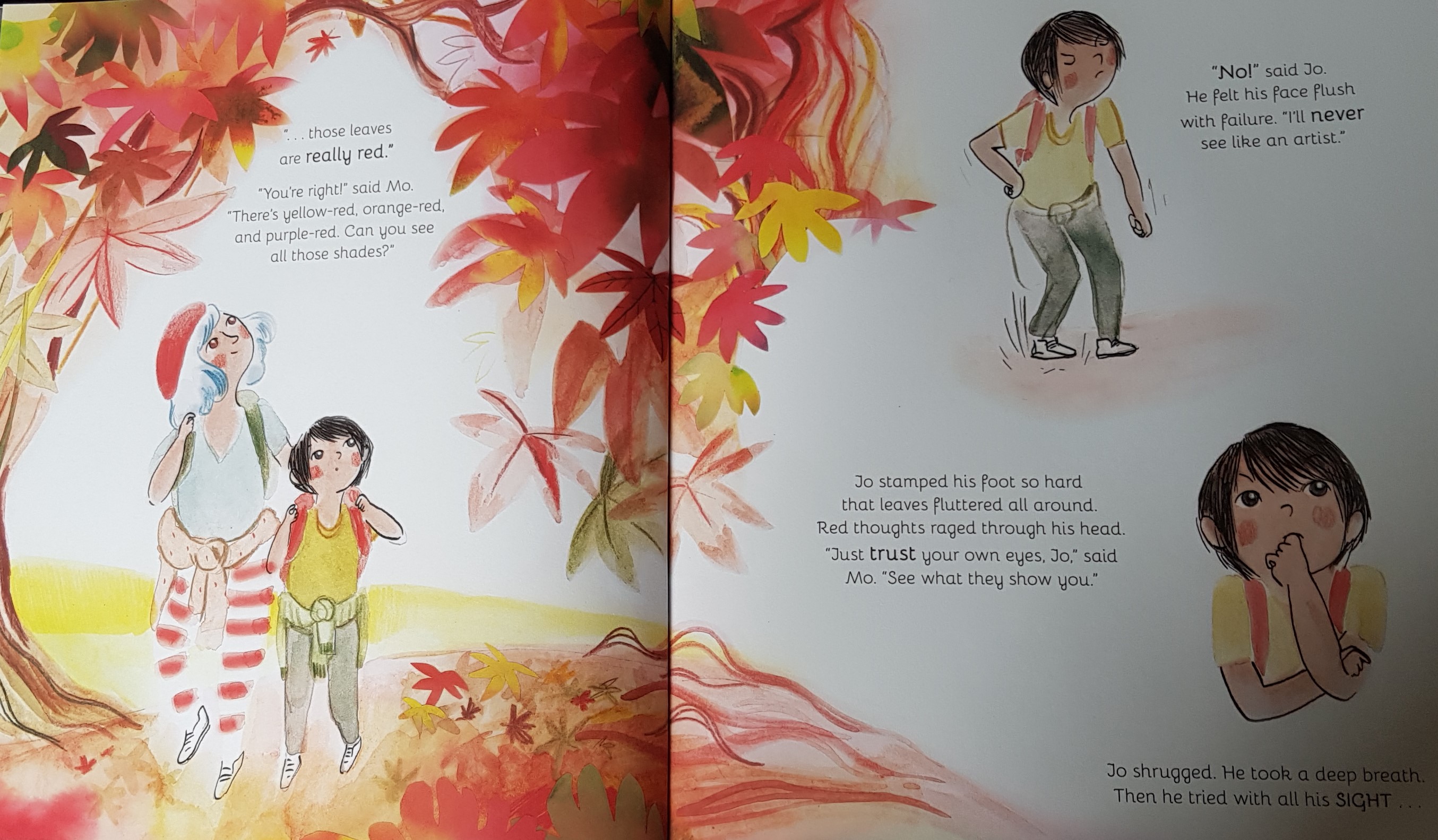 An Artist’s Eyes is illustrated by Clémence Monnet and published by Frances Lincoln Children’s Books. It is the story of a little boy, Jo, who goes on a walk with artist, Mo, to look for colours. But it soon becomes clear they don’t see things in the same way, and Jo gets increasingly frustrated because he thinks he’ll never be able to see like an artist.
