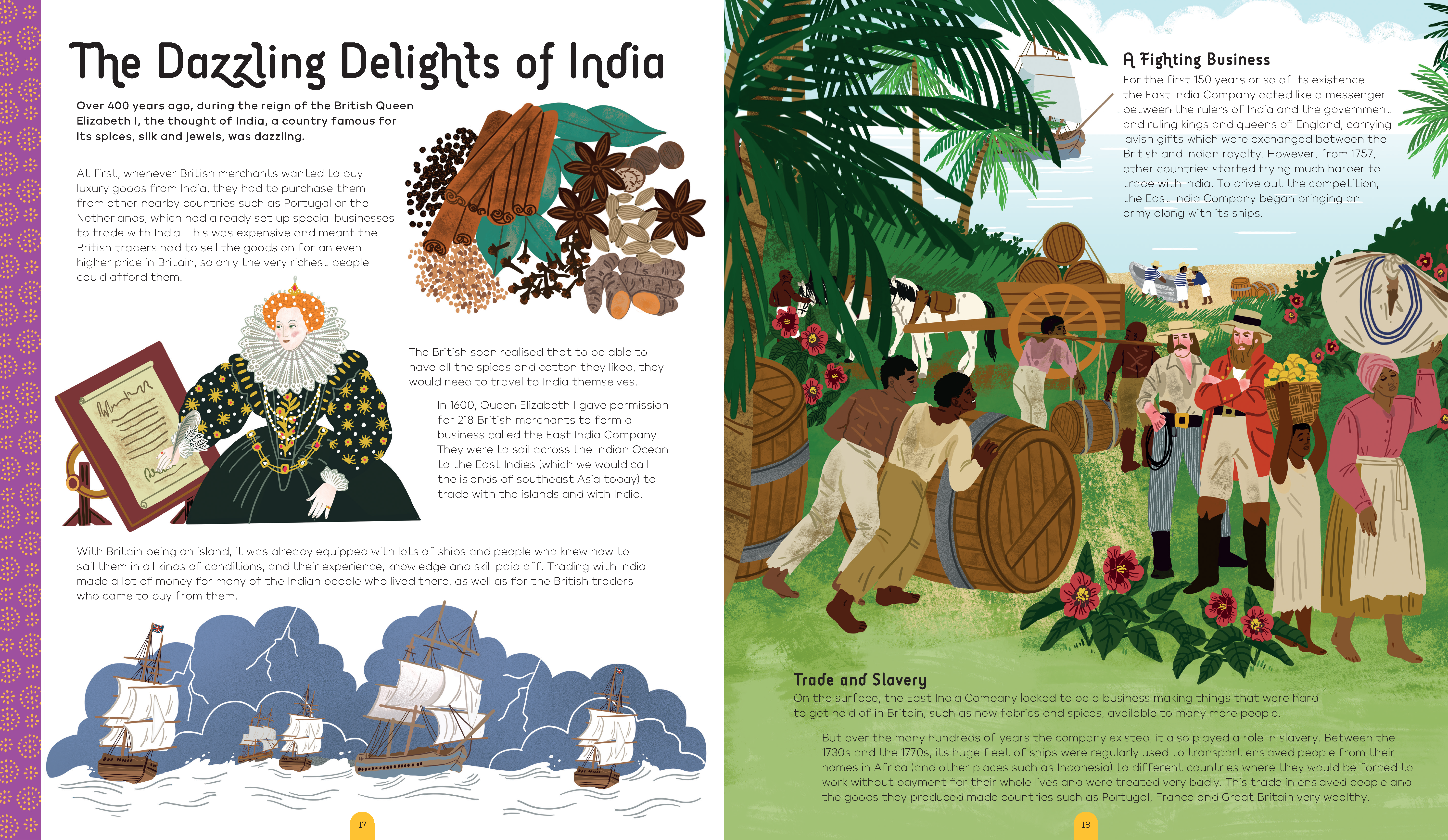 The second half is a look at modern Britain as shaped by Indian, Pakistani, and Bangladeshi people. It was important to Donna and Vikesh to include a diverse variety of Indian culture within the book. She told me that as well as fact checking with friends and family, Nosy Crow were incredibly thorough and provided two academics and many fact checkers to ensure all the information was 100% accurate.