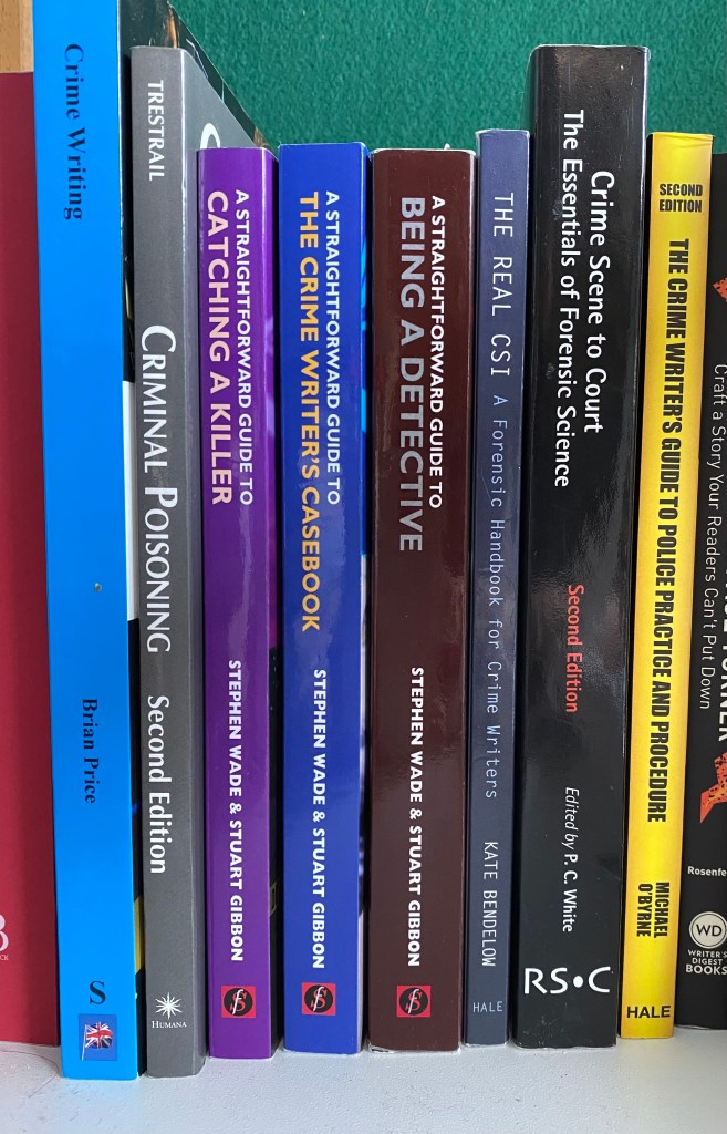 Jane owns a large collection of reference books for crime writers. These include The Real CSI by Kate Bendelow, Criminal Poisoning by John Harris Trestrail, and Crime Writing: How to Write the Science by Brian Price. She also owns all of the Straightforward Guides by Stephen Wade and Stuart Gibbon. Jane explained the series co-author, Stuart Gibbon, is a former UK senior police detective. As well as writing books, he also offers a crime writing consultancy, gibconsultancy.co.uk, providing authors with information to help them write authentically about police procedures.