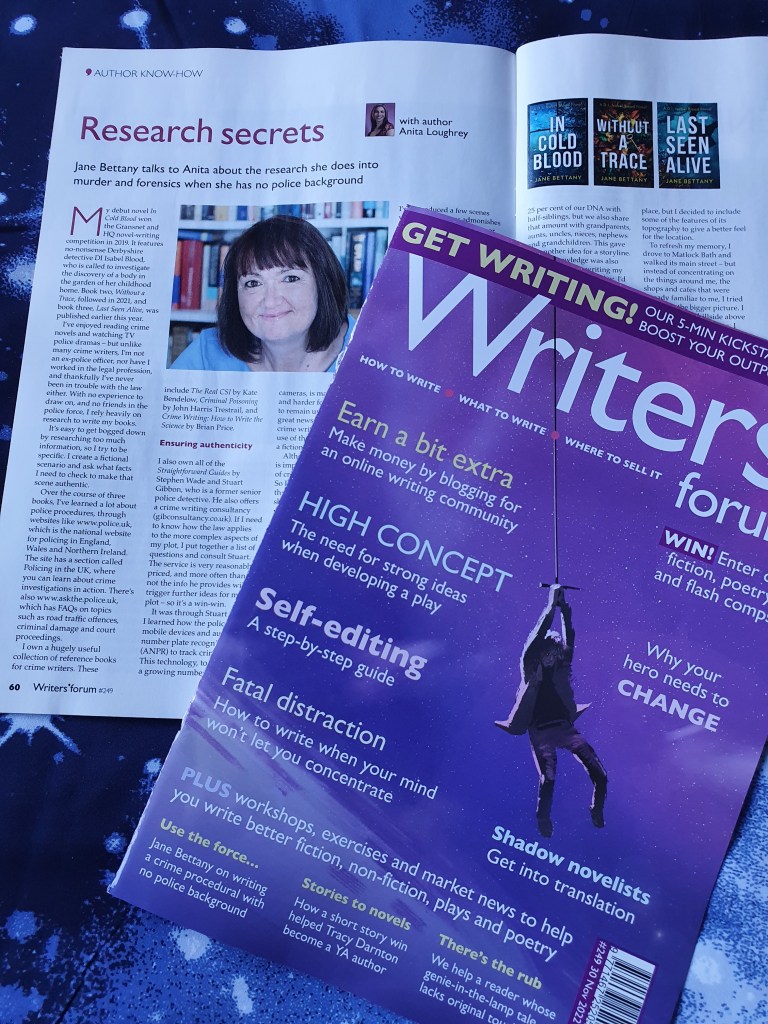 For this month’s issue of Writers’ Forum #249 30 Nov 2022 I interviewed Jane Bettany about the research she does into murder and forensics when she has no police background.