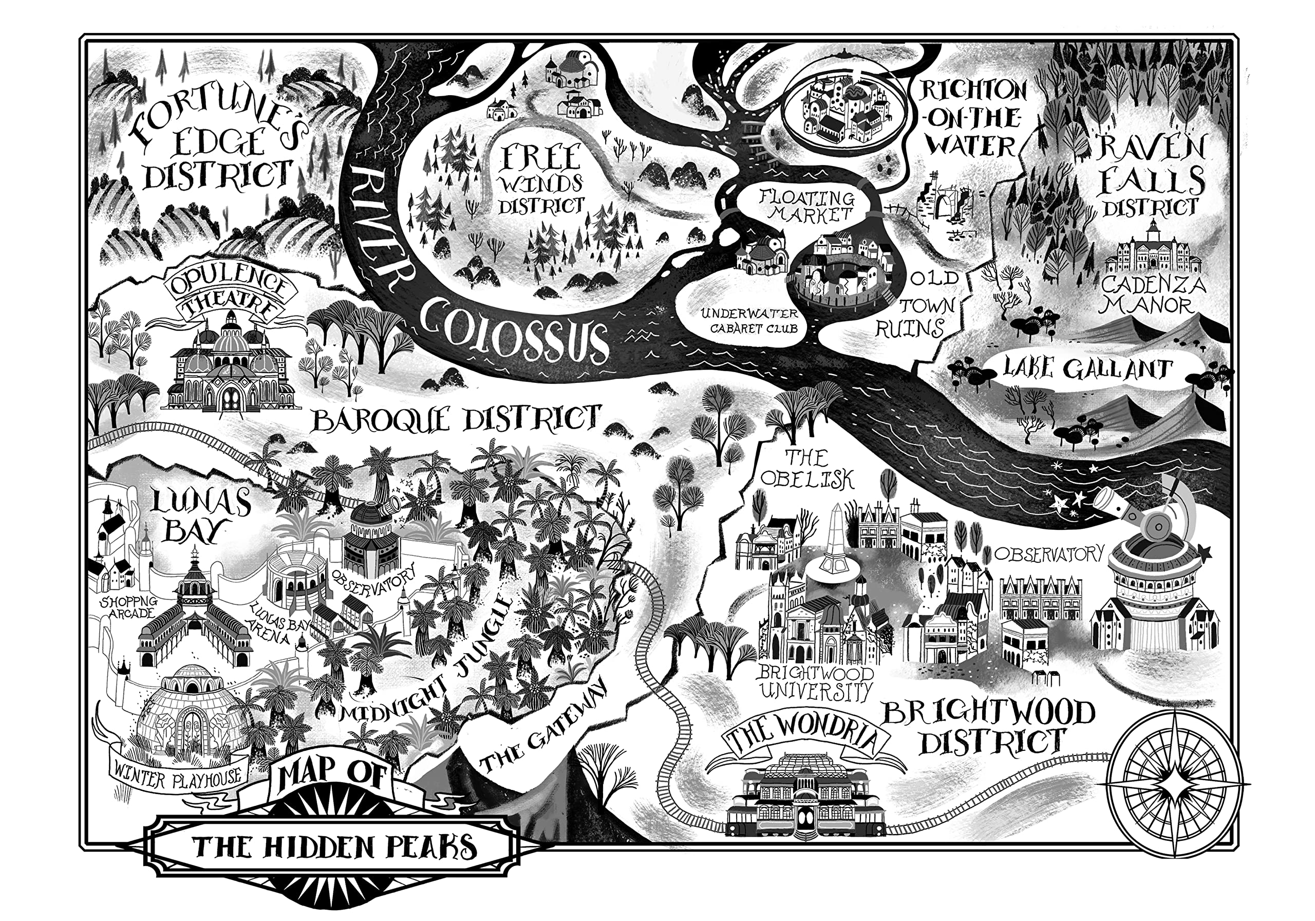When three figures arrive at Harper’s window in a flying canoe, informing her that she is due to start her apprenticeship, Harper discovers she is a Spectacular. Harper is transported away in the canoe, from the rundown Theatre Borough of the Smoke to the amazing magical world of The Hidden Peaks, dressed only in her pyjamas and dressing gown. She arrives at a magical travelling theatre and boarding school, called the Wondria, which is in a tram and has a multitude of floors, an attic and a giant glass dome.