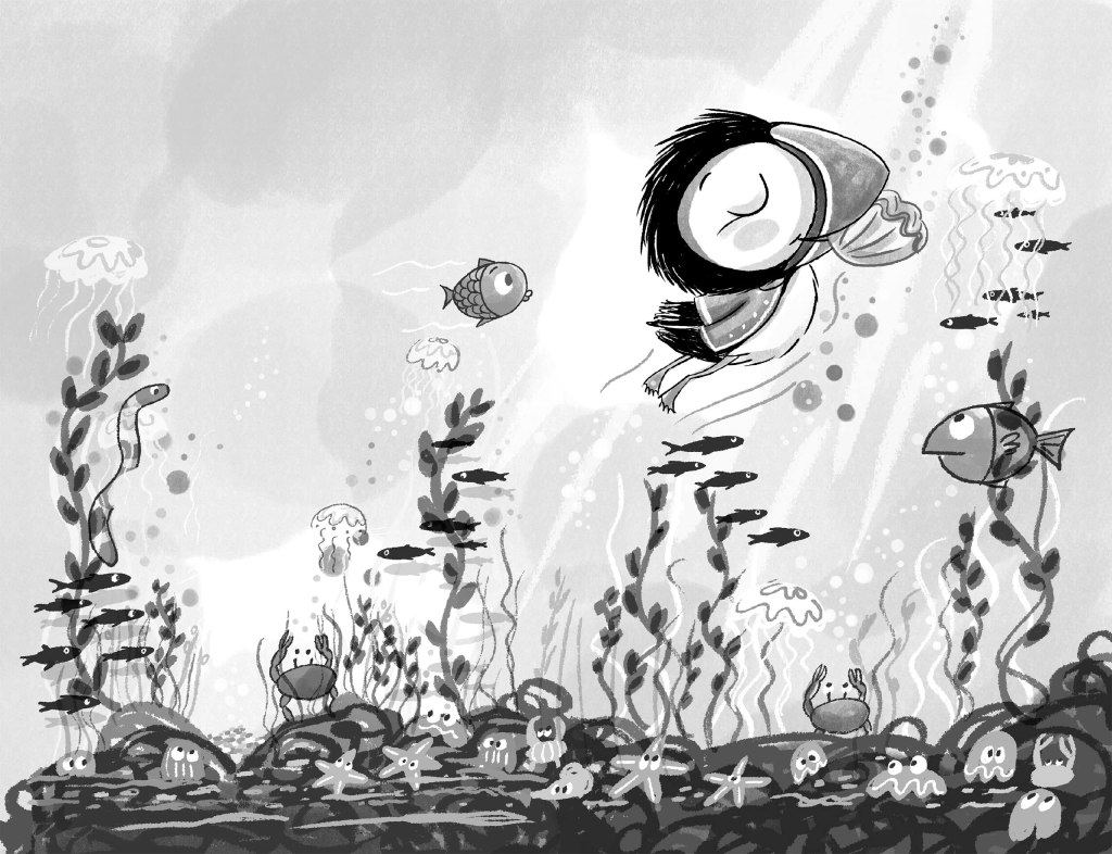 Ella Okstad’s black and white illustrations have they definitive ahhh factor. They are adorable not only because the puffins are extremely cute they also have movement and action.