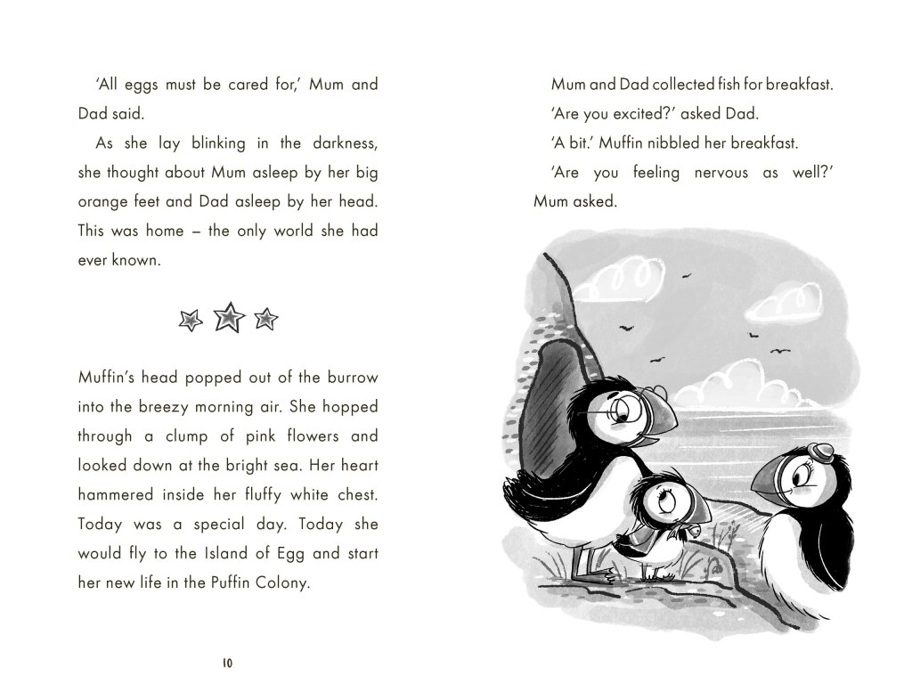 This is a fun and enjoyable adventure for younger readers with themes of bravery, empathy and team work. It is Muffin the Puffin’s first day on the Island of Egg and she is apprehensive about the entrance test to join the Puffin Rescue Team, following in her dad’s footsteps. He explains her feelings are normal for everyone on their first day. Muffin is worried about her feet as they are different to the other puffins, as they turn up on the ends.