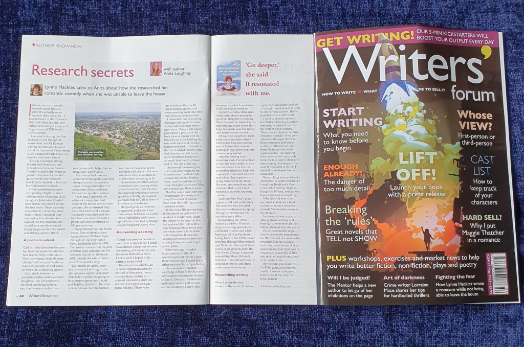 For my last ever Research Secrets interview for the national Writing Magazine, Writers Forum I was lucky enough to interview Lynne Hackle about how she researched her romantic comedy when she was unable to go out of the house.