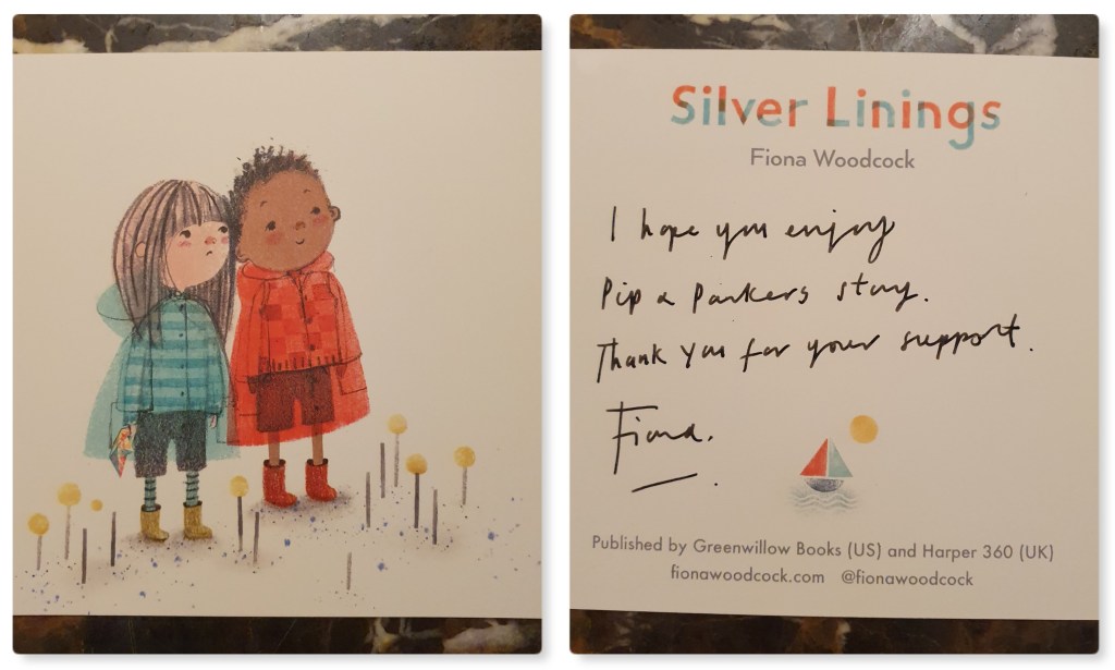 I would like to thank Fiona Woodcock for the gorgeous postcard with the lovely handwritten message I received with the book.