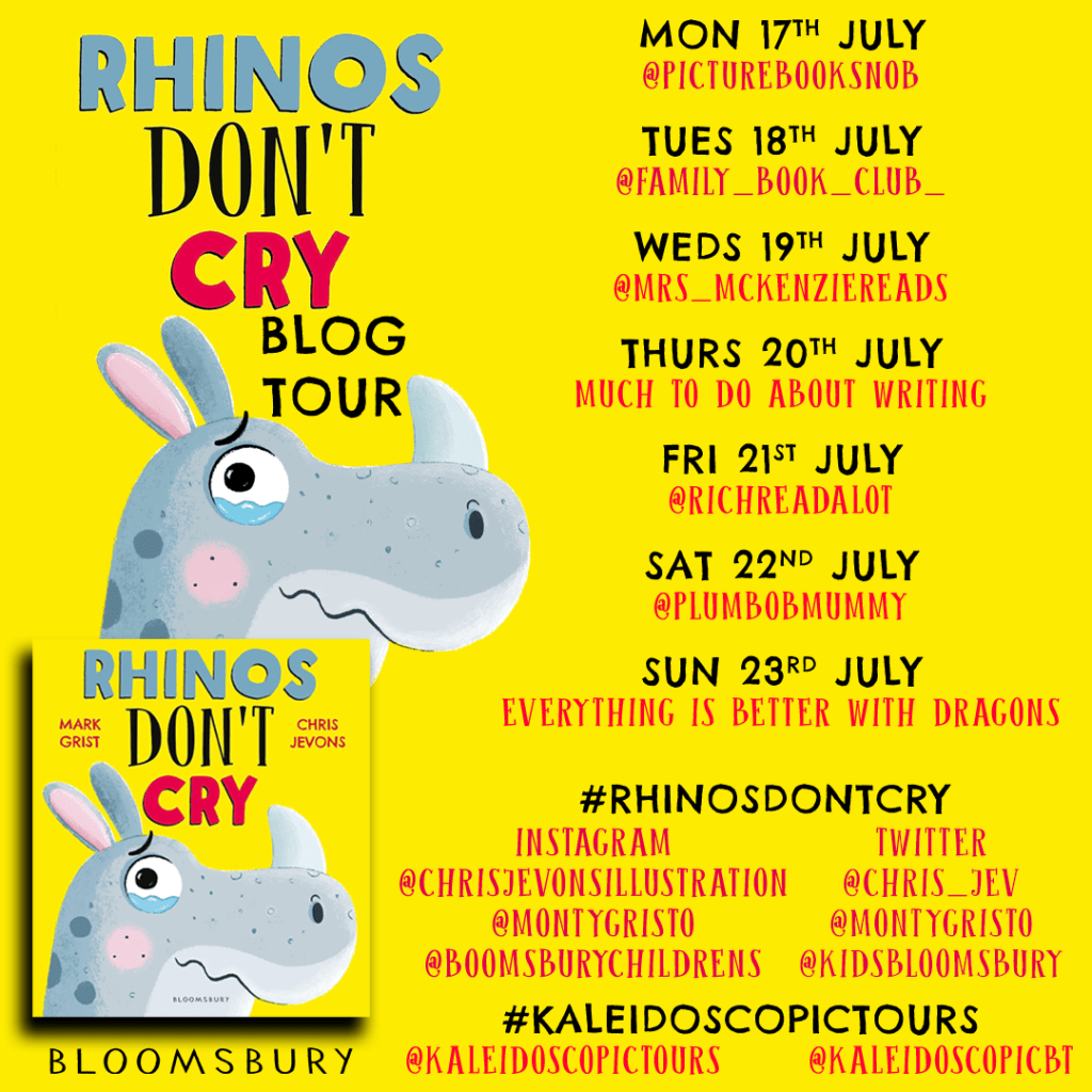 I am excited to announce today, the 20th July 2023, is not only my stop on the Rhino’s Don’t Cry by Mark Grist and Chris Evans blog tour but it is also their Launch Day. Congratulations to both Mark and Chris for the release of this extremely moving picture book, which is planned to be the first in a series highlighting the importance of children expressing their feelings.