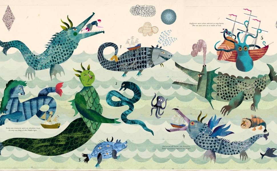 The reader is then taken on an extraordinary journey around the world’s oceans. Each double-page is highly detailed and jam-packed with fascinating information on historic events, famous people and scientific facts. I particularly liked the spreads on the art of navigation, history of sailor’s tattoos, exotic sea life, myths and legends and pirates.