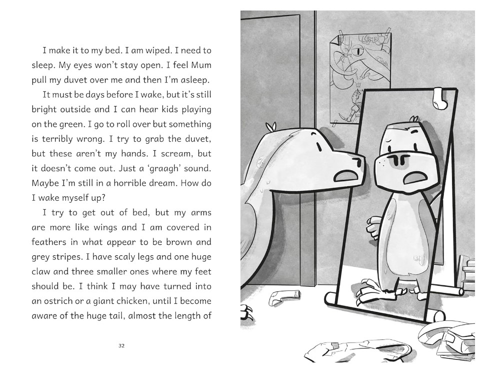 A hilarious and heart warming chapter book for readers aged 6+ about a boy with ADHD who is transformed into a dinosaur, with dynamic black-and-white illustrations throughout.
